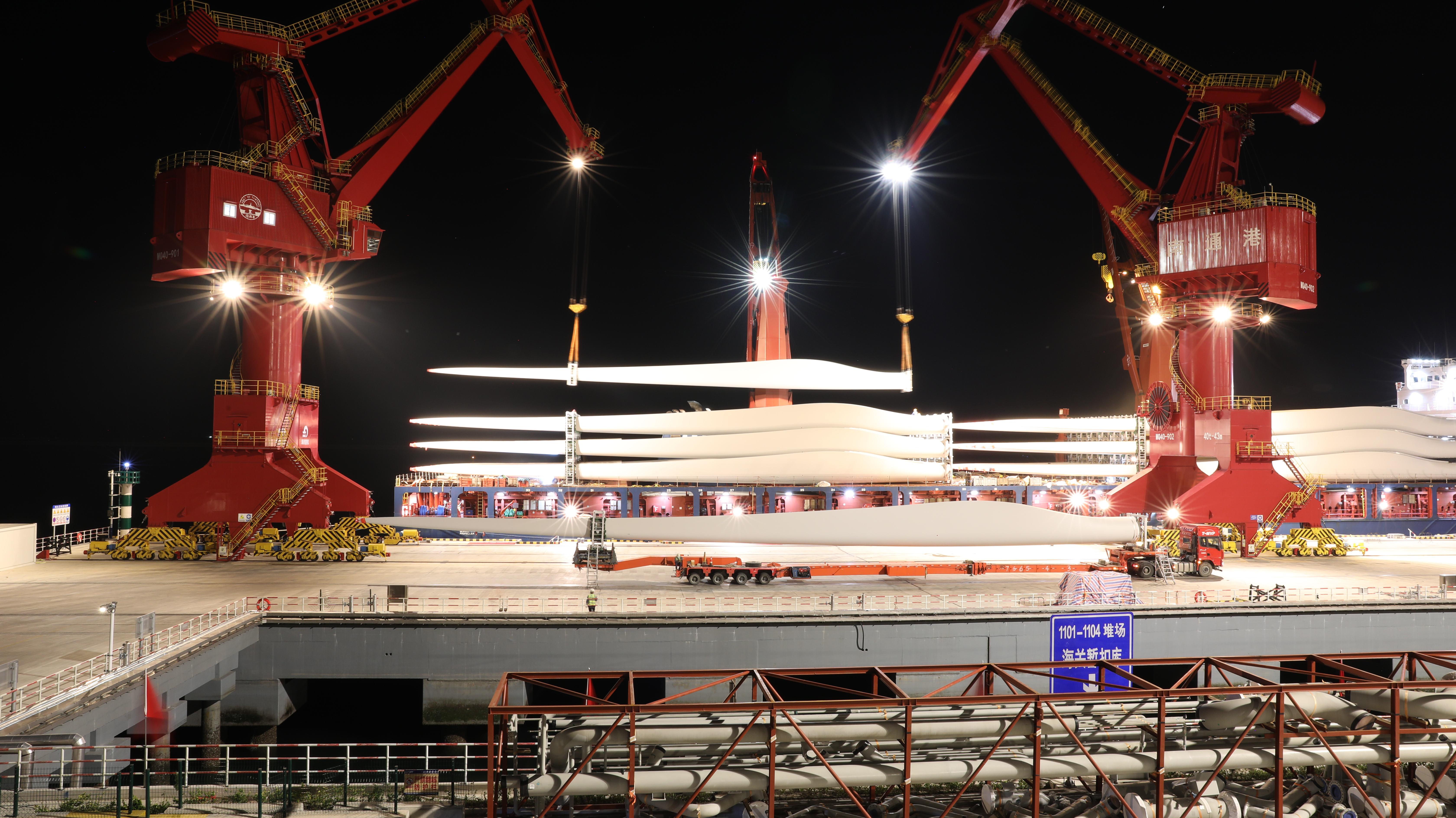 10月28日15時,公司11#泊位剛送走滿載遠航美洲的“羅納河”輪,又迎來了開港以來風電葉片單船裝載量最多的“極速”輪。該輪將裝載111片V110型號、8.12萬立方、價值超過7千萬元的風電葉片出口歐洲。為提高海輪作業效率,公司聚焦客戶需求,對貨物集并、場地安排等精心準備,并加強內外部的協同配合,選派經驗豐富的精干力量組成國際航行船舶作業專班。同時,公司以技術創新為抓手,多維度助力生產需求。經多次論證、實地試驗和完善優化門機照明系統,有效解決了夜間作業照度不夠、視線不清、定位困難等堵點,開啟了風電葉片夜間作業“新模式”,打破風電葉片只有白天作業的“舊常規”。