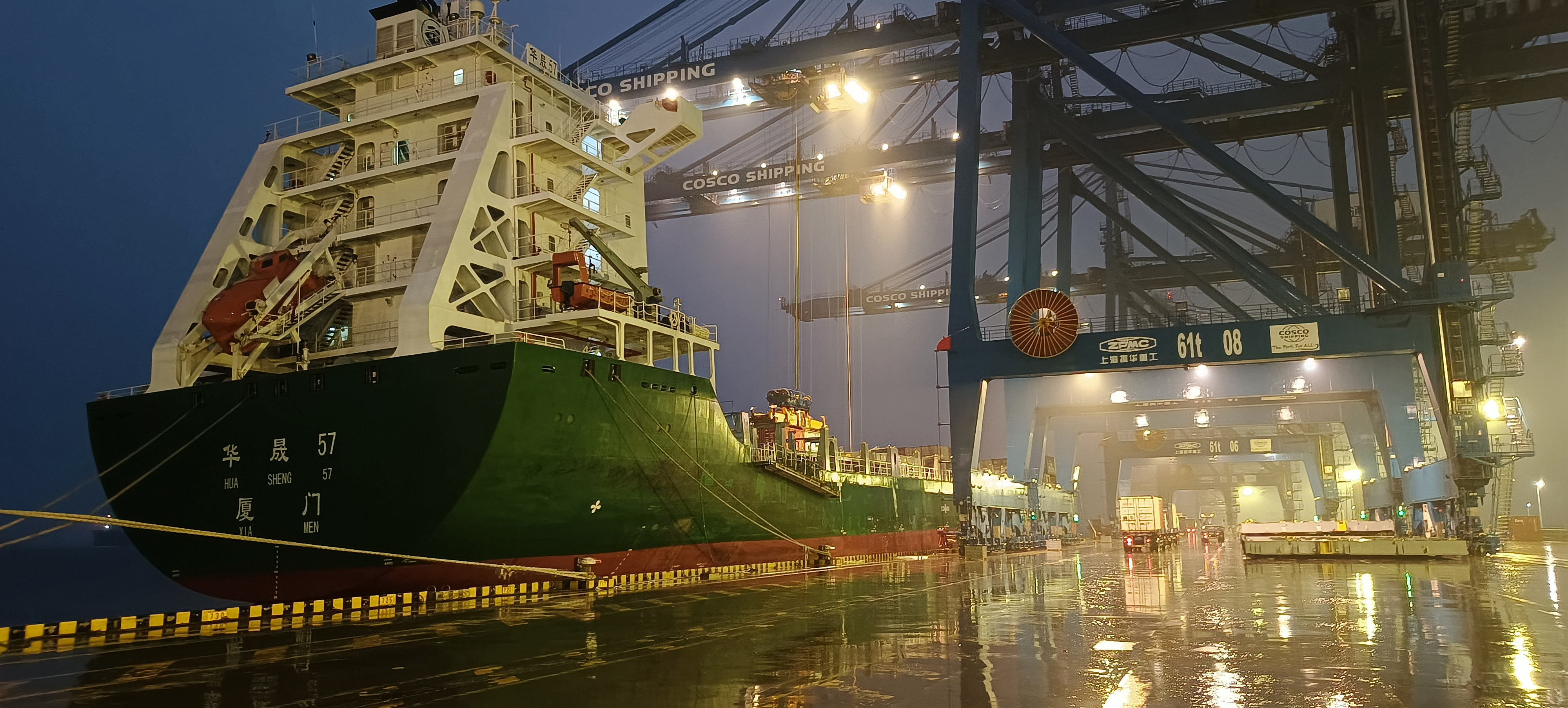 本次作業(yè)箱量大,兩條干線船舶箱量合計4976標箱。針對連續(xù)陰雨、道路濕滑、雨霧天氣視線不佳給生產(chǎn)作業(yè)帶來的不利影響,公司積極應(yīng)對、提前部署、全力備戰(zhàn)。運營管理中心合理安排船舶作業(yè)計劃,優(yōu)化堆場布局和資源配置,著力提升效率,保證船期。工程技術(shù)部安排維修人員24小時待命保班,及時修復(fù)突發(fā)性機械故障。安全員加強作業(yè)現(xiàn)場監(jiān)管力度,提醒司機路滑減速慢行,全力維護作業(yè)秩序,保障作業(yè)現(xiàn)場安全受控。經(jīng)過近16個小時的連續(xù)奮戰(zhàn),11日晝夜完成集裝箱吞吐量6315TEU,最高船時效率達116自然箱/小時。